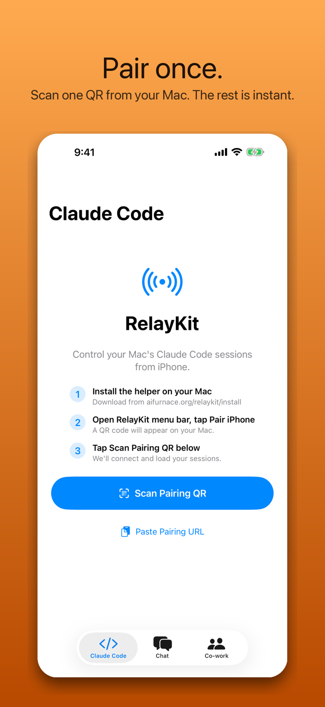 From pairing to streaming Claude's work to Cowork plans — what RelayKit looks like on a 6.9″ iPhone.