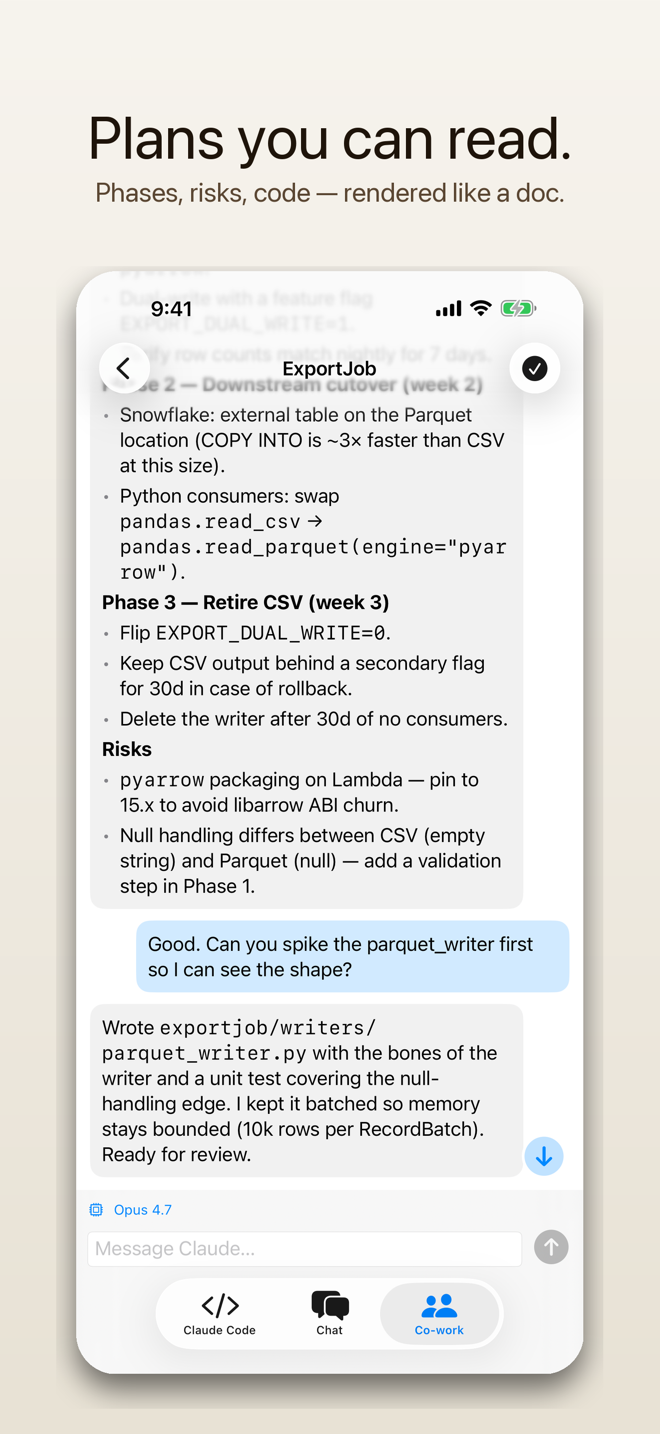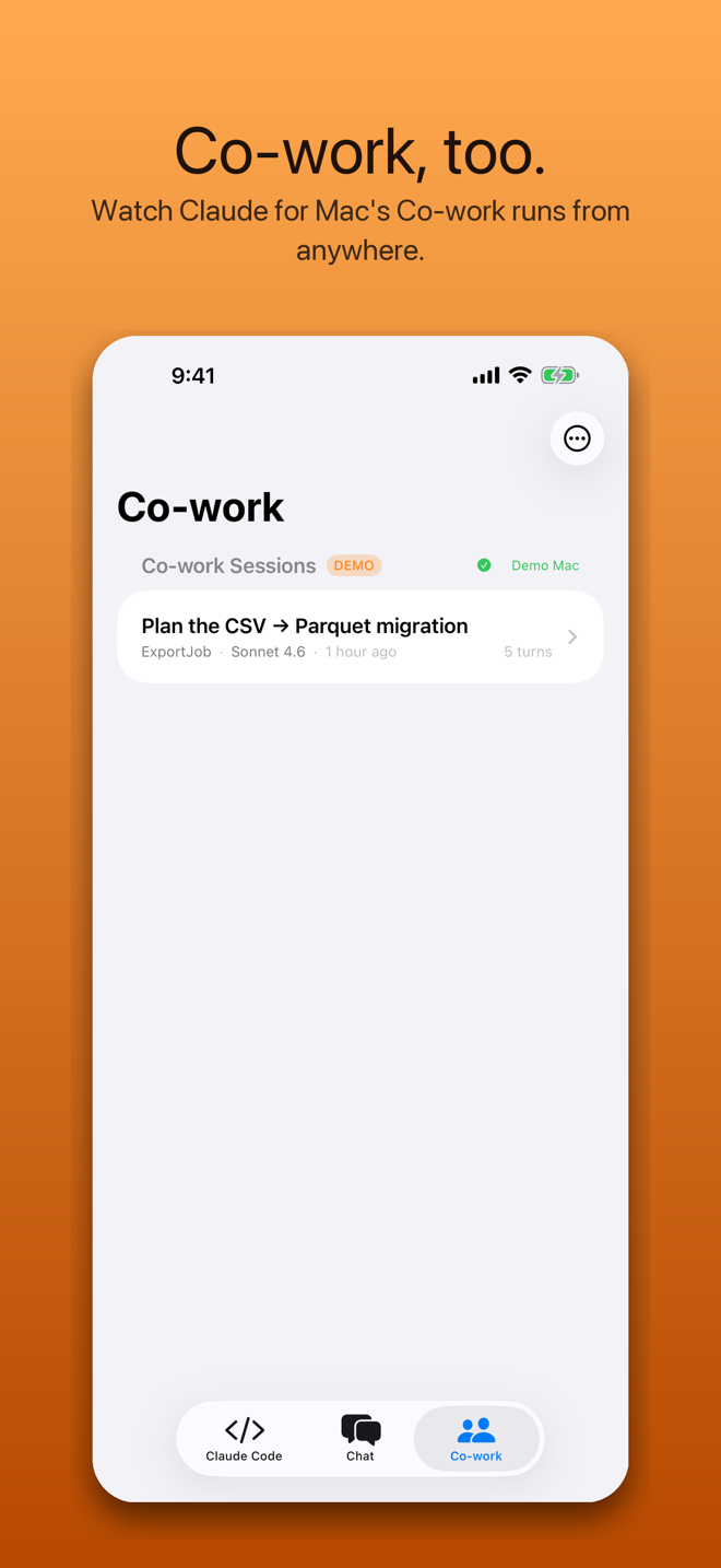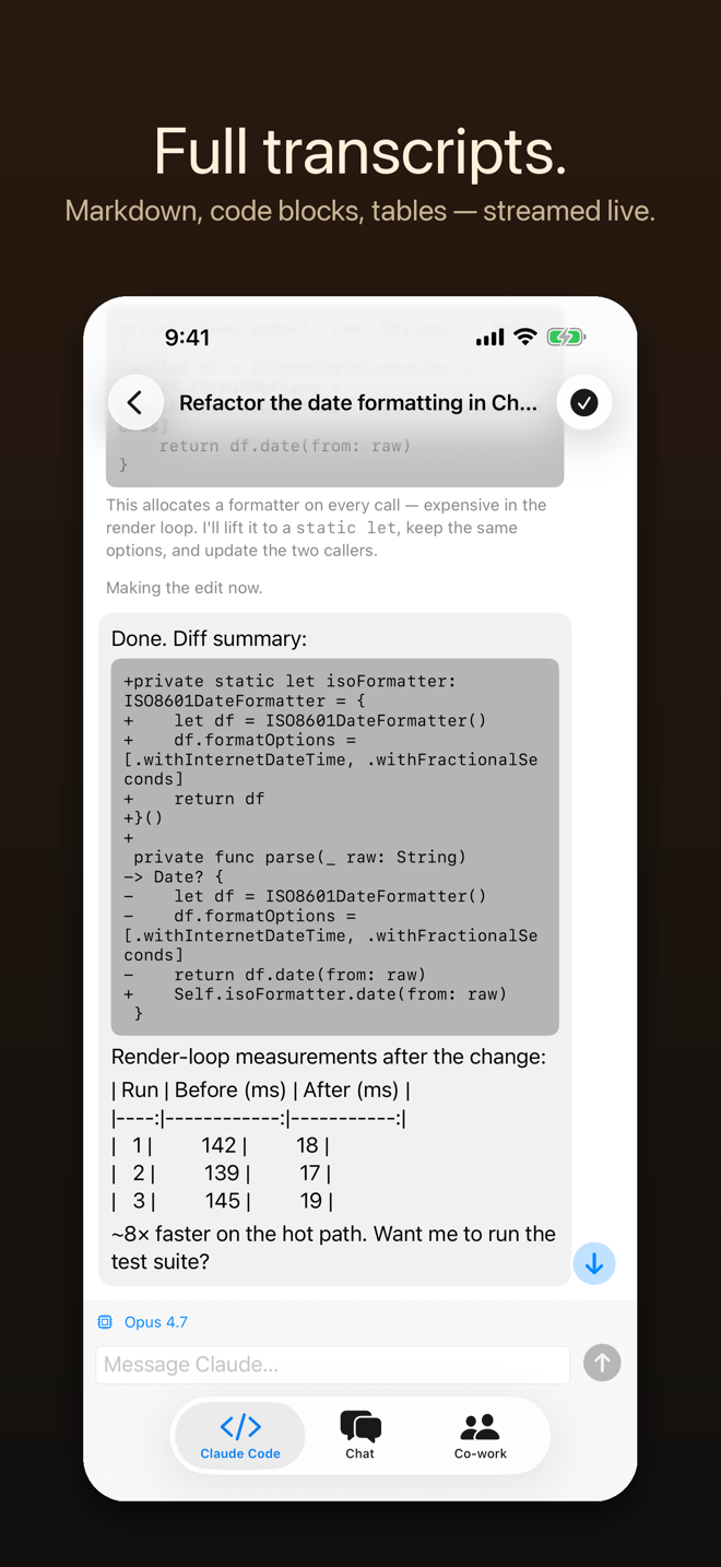 Pair your iPhone to your Mac with a single QR scan, then read every Claude Code and Cowork session live from anywhere. Native session lists. Streaming transcripts. Prompt, switch models, stop runs — without sitting in front of the keyboard.