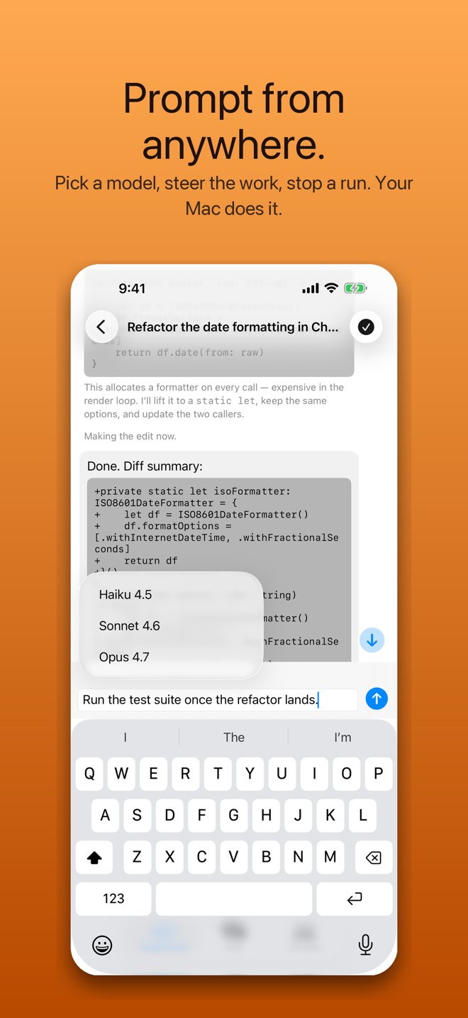 Send a new prompt, pick Opus / Sonnet / Haiku, fork to try an alternative, stop a run mid-flight. Your Mac does the work.